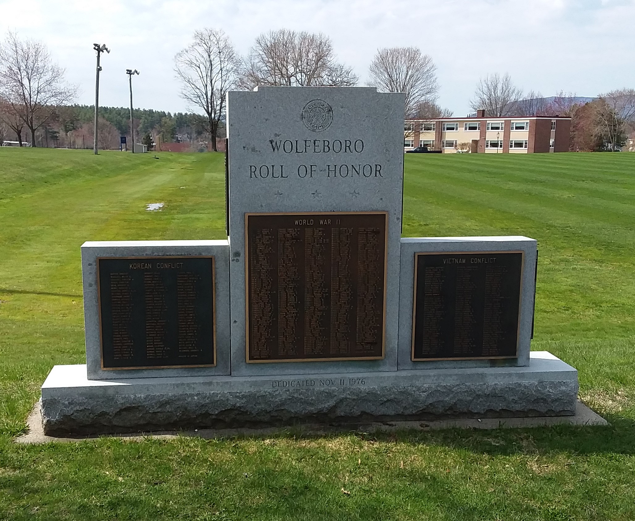 The Wolfeboro Roll of Honor at Pickering Corner was dedicated on Nov. 11, 1976. Plaques on the front include the Korean Conflict, World War II and the Vietnam Conflict. Additional plaques on the side include the Korean Conflict, Vietnam Conflict, and the Panama and Gulf Conflicts.