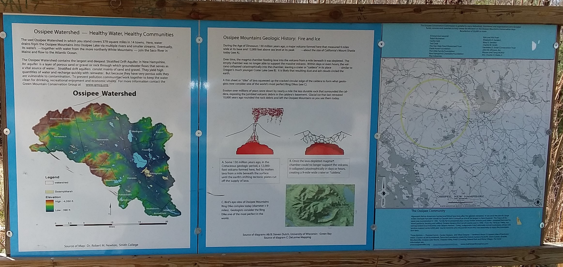 These details on history and conservation in the Ossipee Mountains are in the stand at the view area on Route 16, north of the junction with Route 28. Click twice for enlargement.