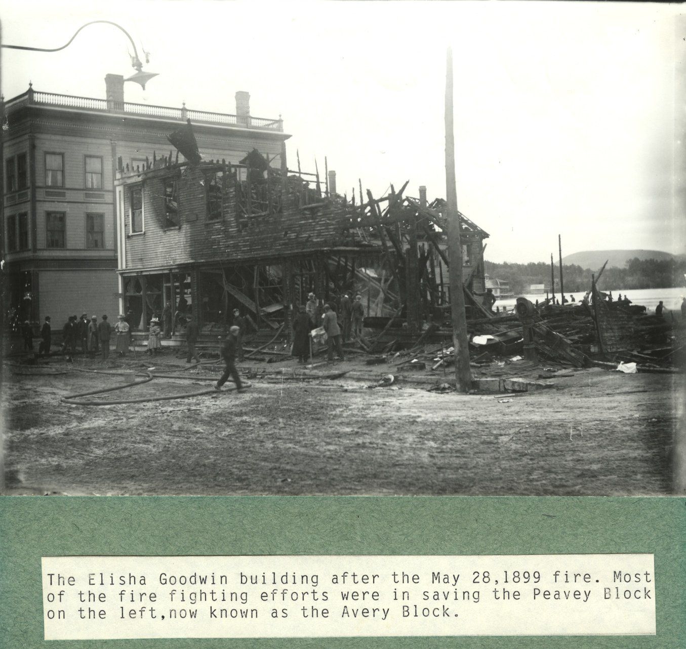 Photo taken from North Main Street, just across the downtown bridge. With the flames and ashes spreading to the wharves and several buildings behind the Goodwin Block, it is surprising that the adjacent Peavey Block (now known as the Avery Block) was saved.