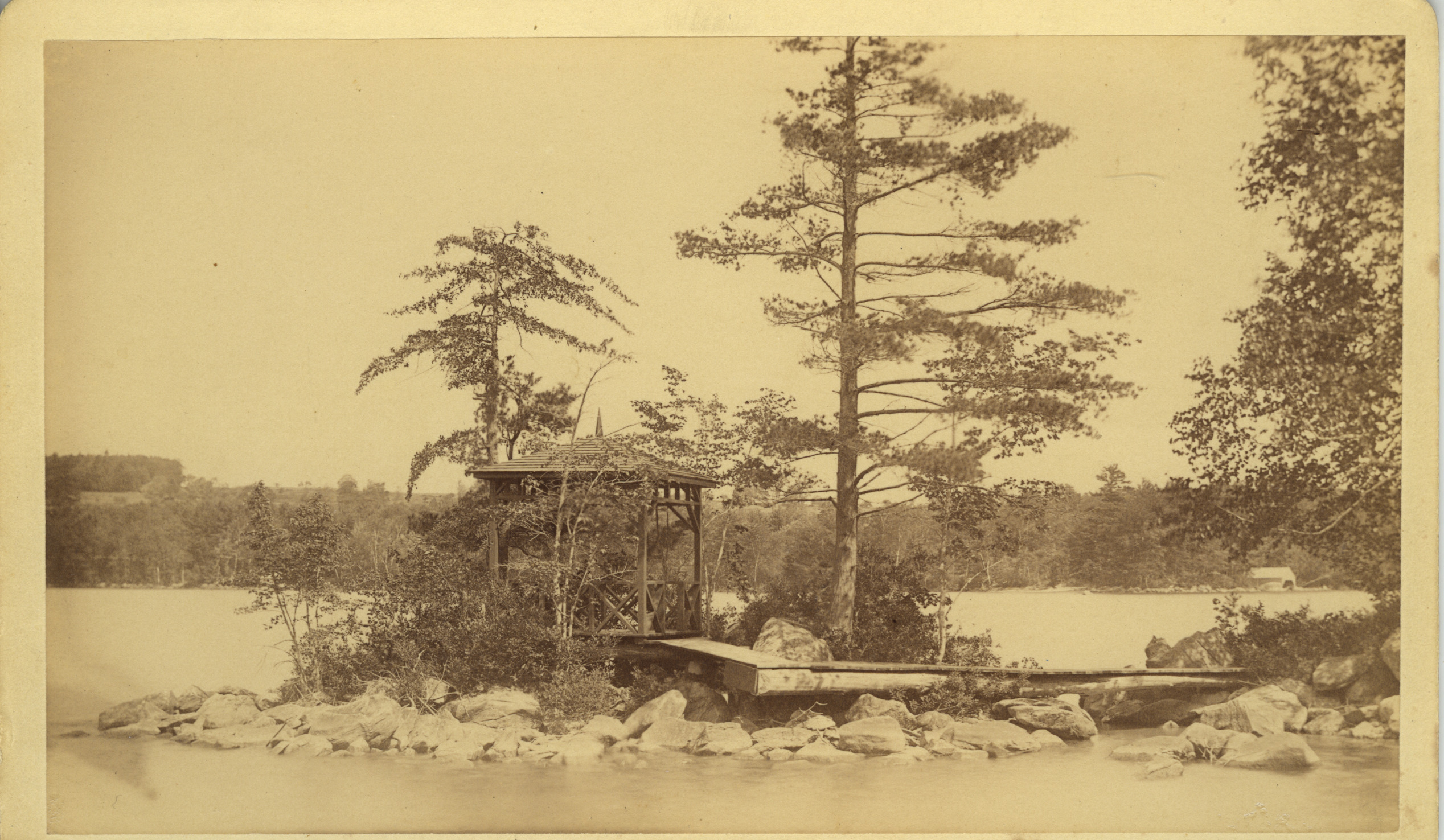 Fred E. Meader gazebo and shorefront. This property was called "Pinehurst" and became part of Camp Wyanoke, a large boys camp, in 1909. The location is a short distance past Carry Beach. This type of gazebo, four-sided, railings made of logs and branches, with a peakedd roof, was a popular design. Several others were seen in the area.