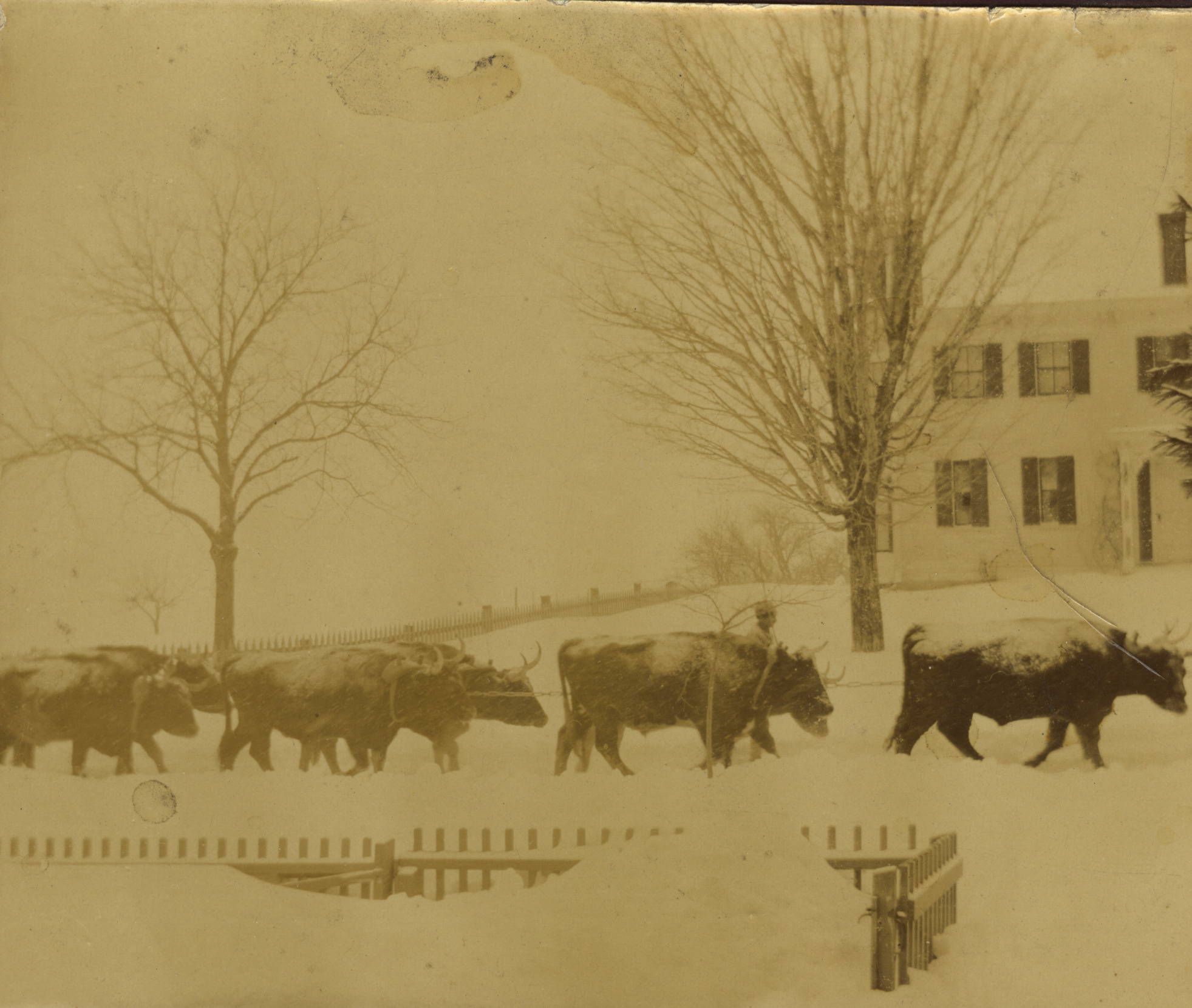 This is a team of oxen pulling a snow scraper on North Main St. Photo is after 1883. The house on the right was built c. 1768 as settlers farm No. 1. Early families were Lucas, Nowell & Manning.