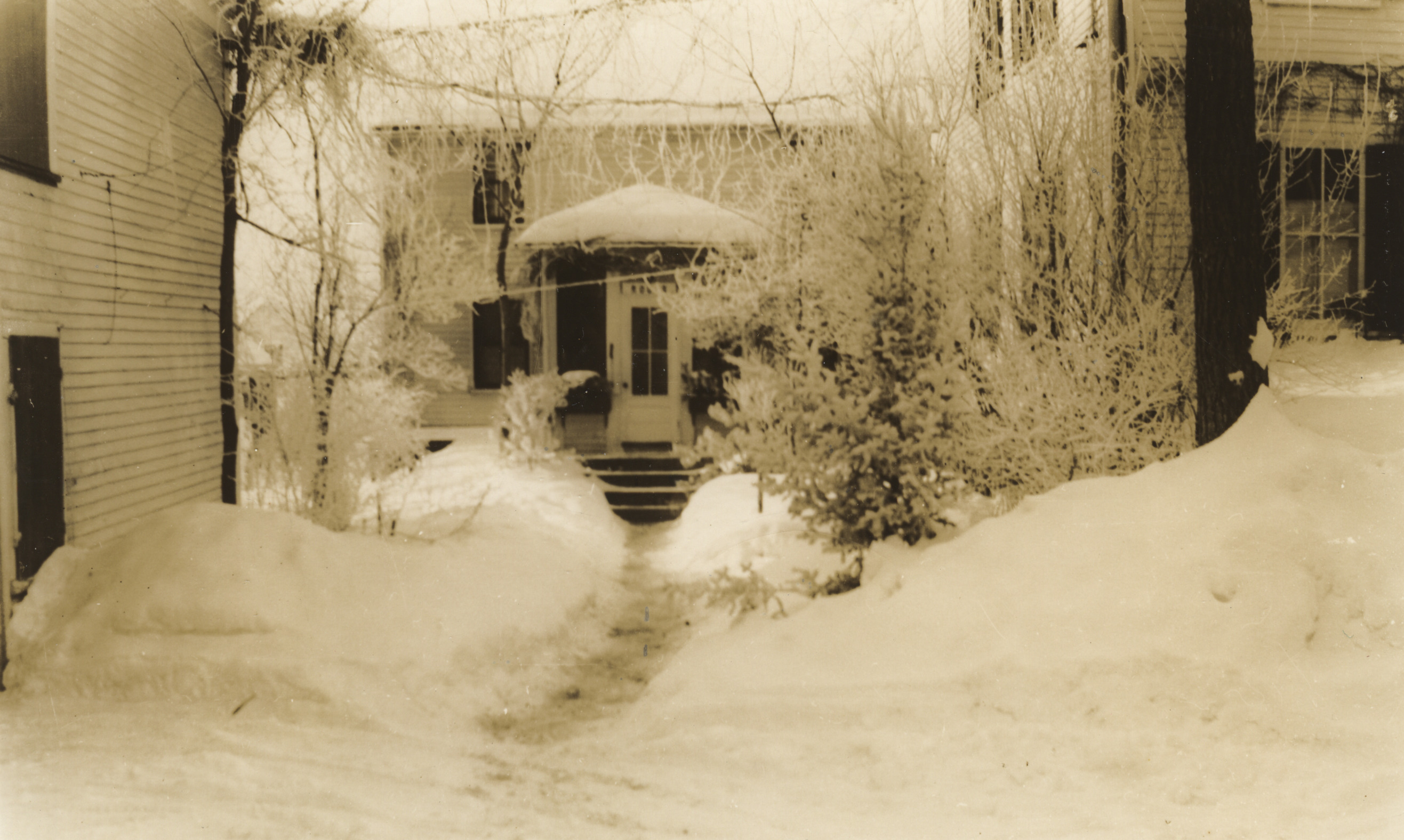This is the home of Nellie Graves on Woodbine Ct., April 12, 1939. The house is on the east side behind the former Camelot Bookstore on North Main St., now a health spa. The photo is taken from a path between two houses across the narrow street. Nellie was a well known teacher in the Pickering & Carpenter Schools.