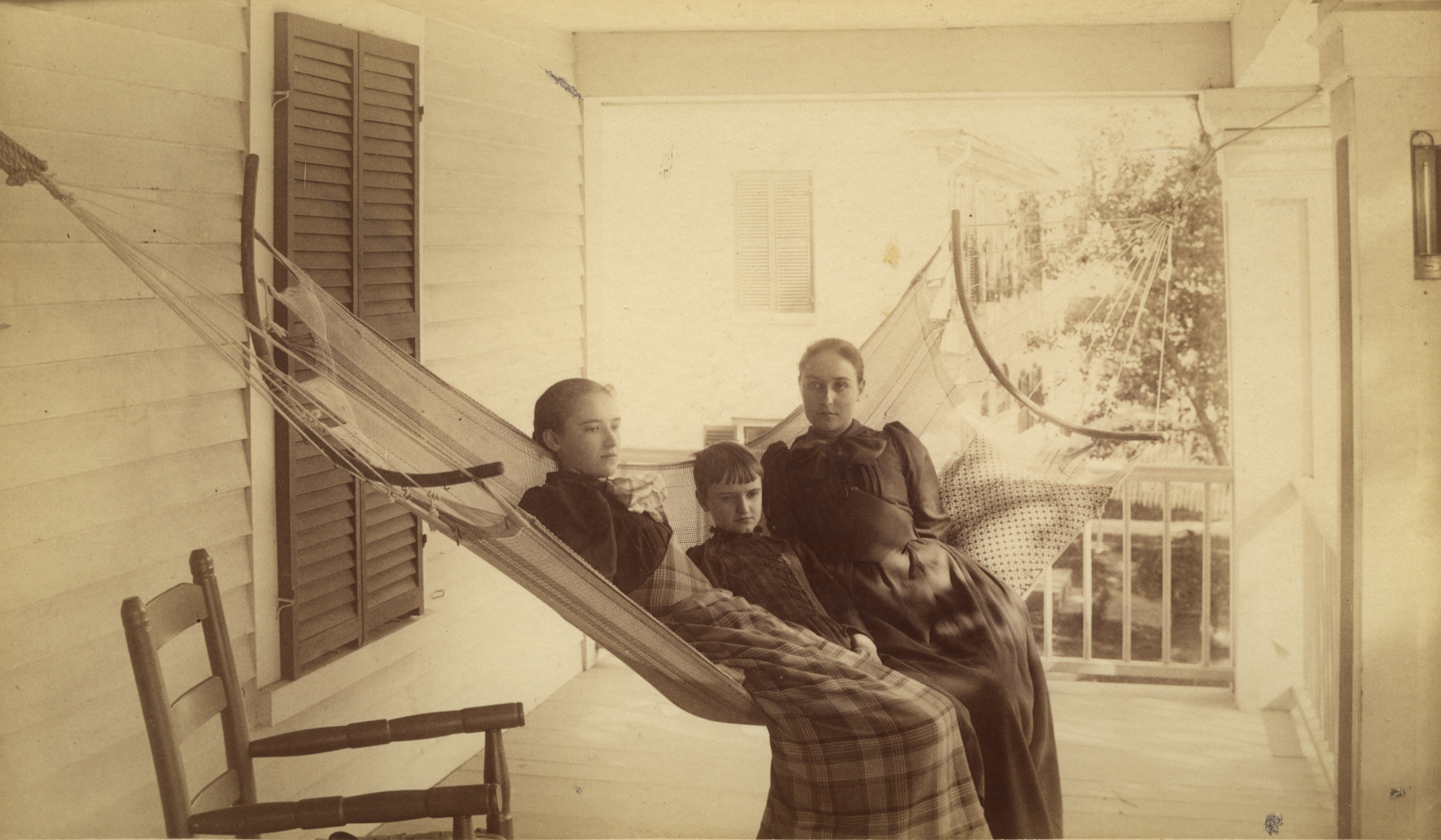 Second floor of the Samuel Avery house, also knonwn as the Whitton house, on South Main St. between the Pickering House & the brick Scott house. Date unknown. L-R, Esther, Louise & Sarah Whitton.