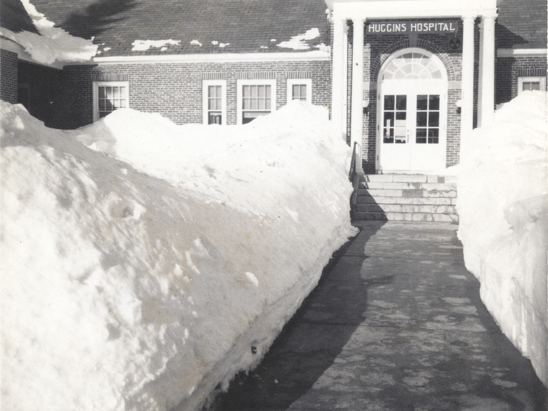 Winter view of the entrance to the 1924 Huggins Hospital, c. 1930. Definitely one of the tougher winters.