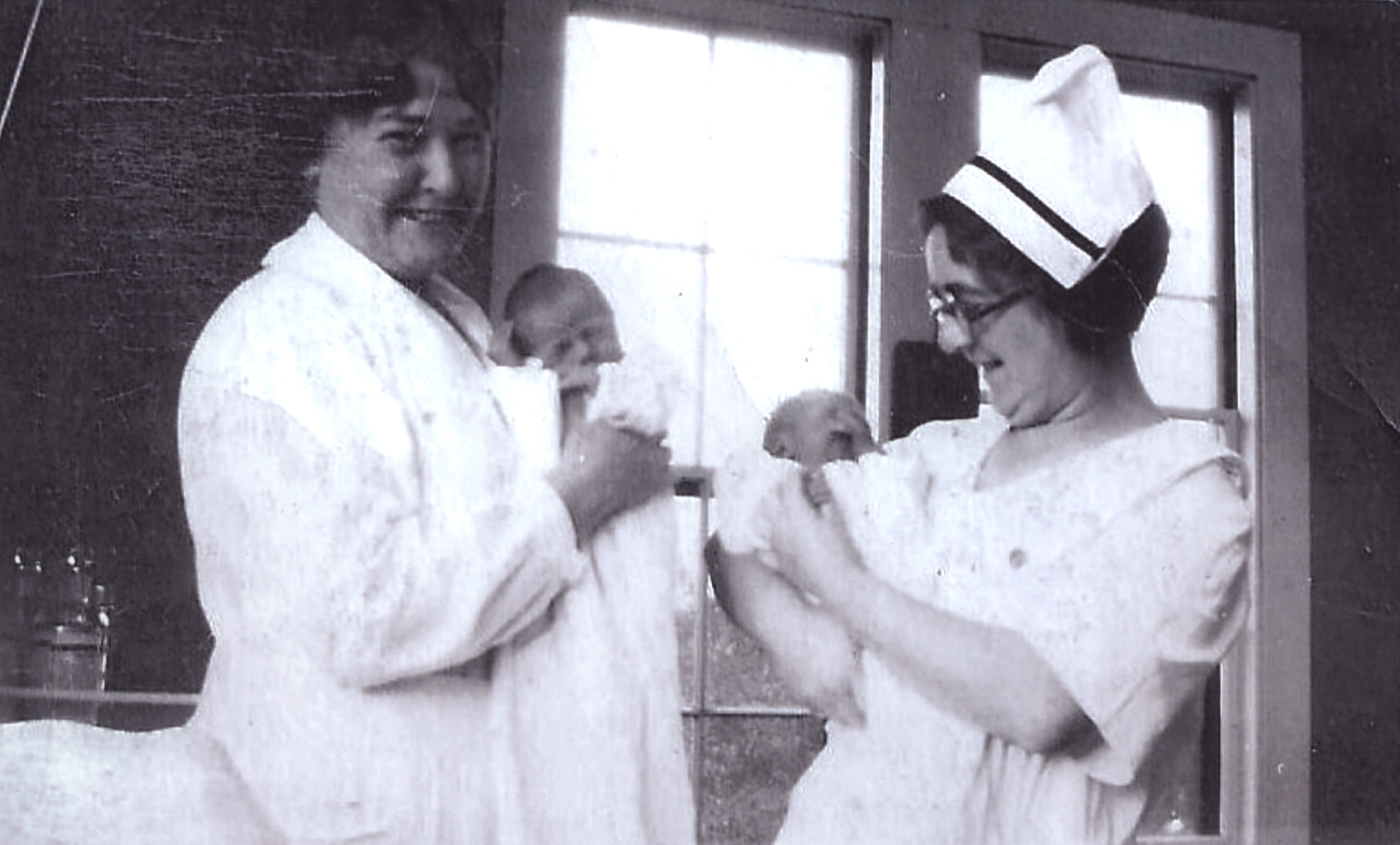 Nurses with babies in the Huggins Hospital solarium, c. 1925.