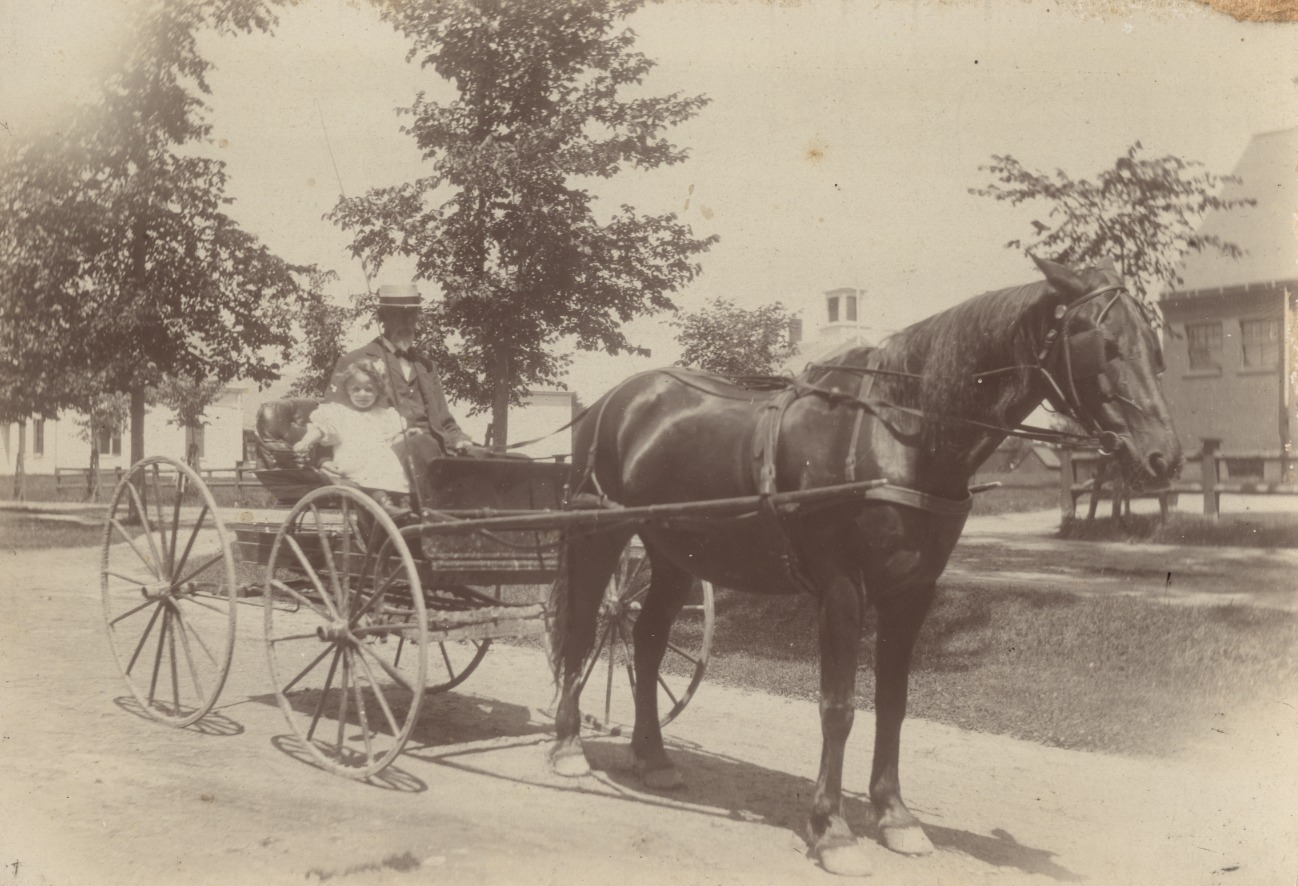 John L. Peavey, prominent businessman in many fields, with Bertha Coffey, daughter of Tom Coffey, clerk at Hobbs-Is-Inn. Horse is "Ned", a very large Morgan. Photo taken c. 1897 at corner of Union St. and S. Main St. Cupola of the Wolfeboro and Tuftonboro Academy shows above horses neck.