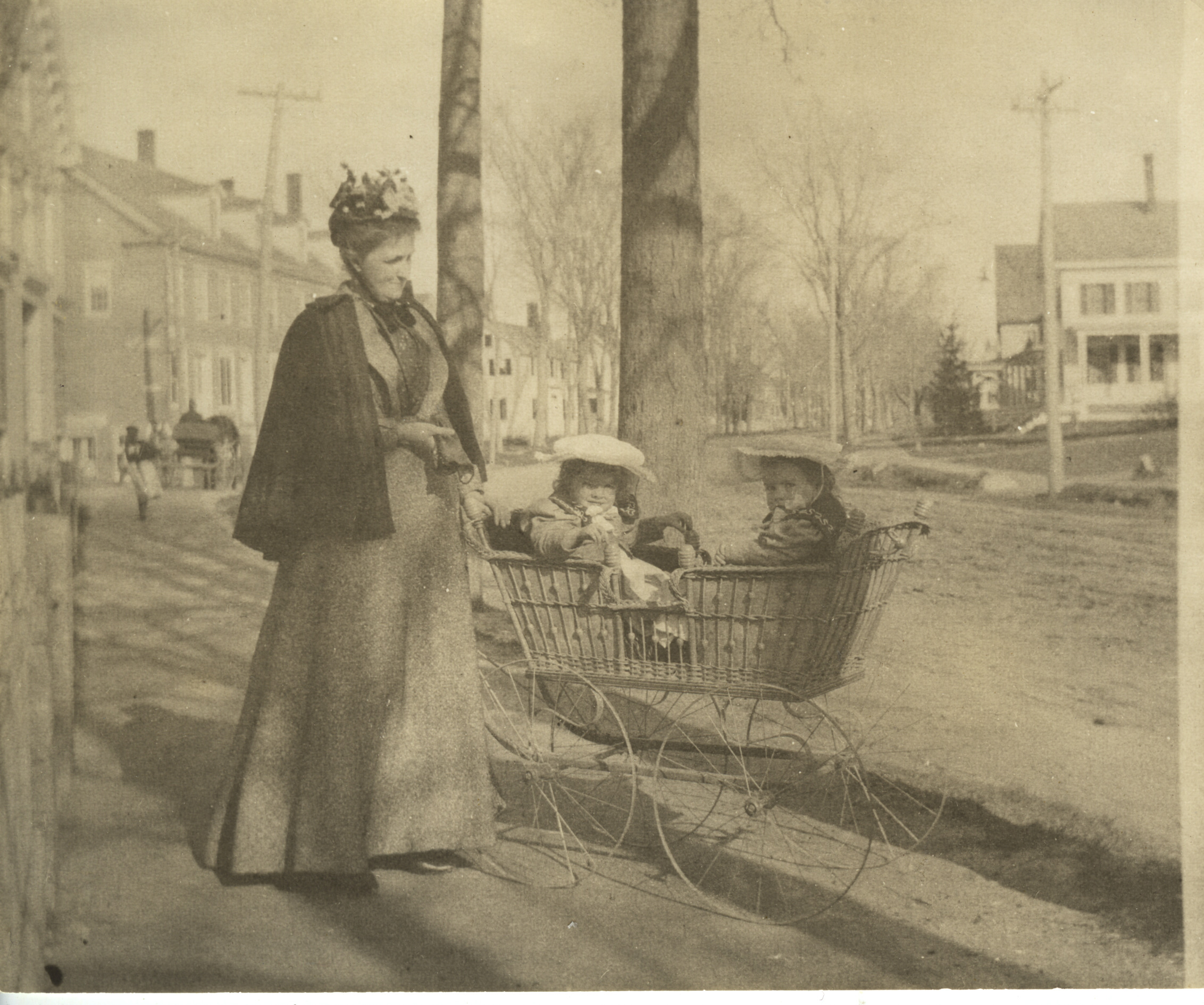 Ethel and Edith Scott, twins born in 1895, go for a ride on a late winter day. The background is South Main St. looking toward Pickering Corner.