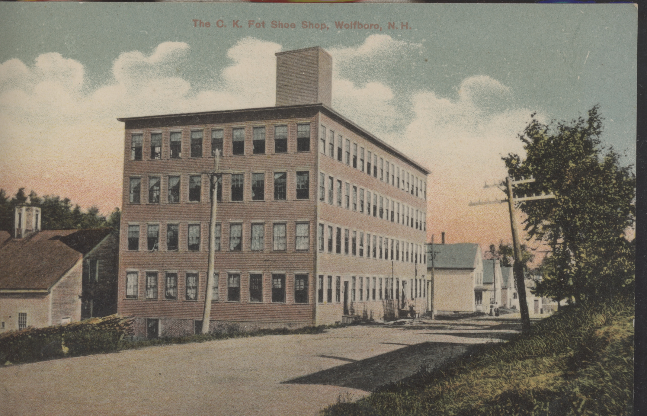 This building on Factory Street (now Lehner Street) was built in 1895 by Greenleaf B. Clark and other investors and occupied by the C.K. Fox Shoe Factory from 1903 to 1923. The top two floors were removed in 1982 and the Sanel Auto Parts store was there. The view is from the Community Center toward Center Street, early 1900's. Note that Fox is misspelled and the "e" is omitted in Wolfeboro. The building was also known as the Clark Shop or "little factory", a comparison to the Bell Shop or "big factory" which was located on the street closer to Glendon Street.
