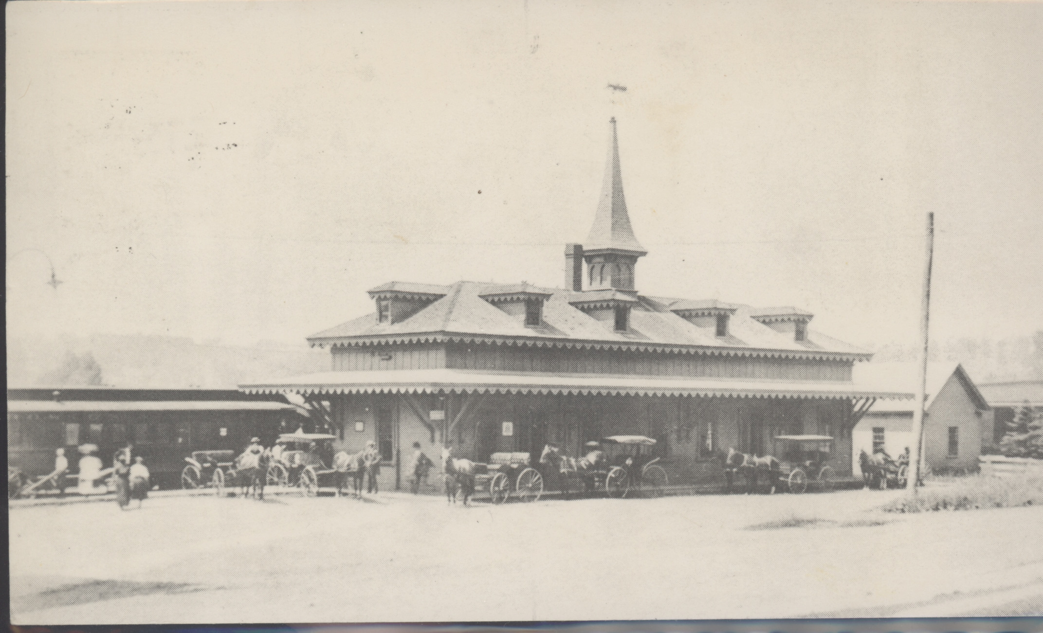 Wolfeboro Station in early 1900's. Boston & Maine train has arrived. Building on right was the express office. Recreated.