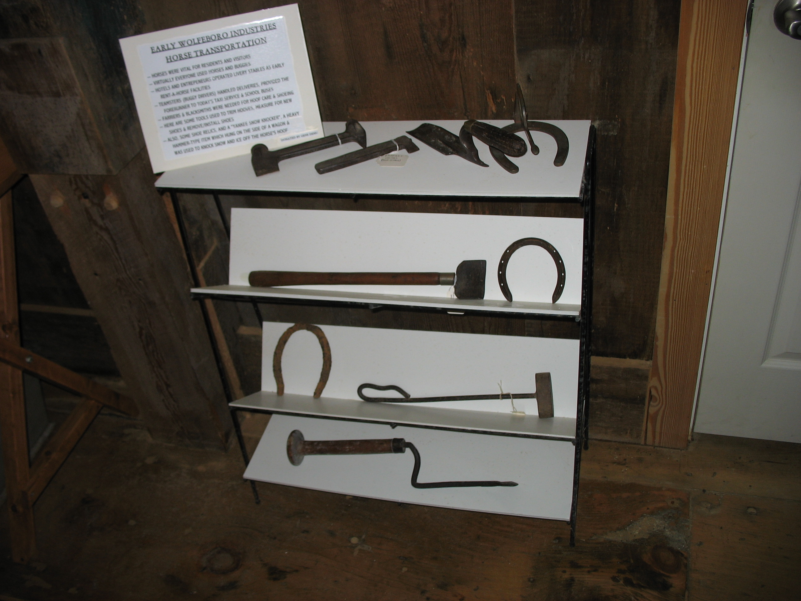 Horses were very important to the early settlers. This collection of tools includes farriers and blacksmiths items used to trim horses hooves, measure size for tailored horseshoes, and a couple of old shoes. The item with the curved handle is known as a "Yankee Snow Knocker"; it would hang on the side of a wagon and be used to clear snow from the horse's hoof in the winter.