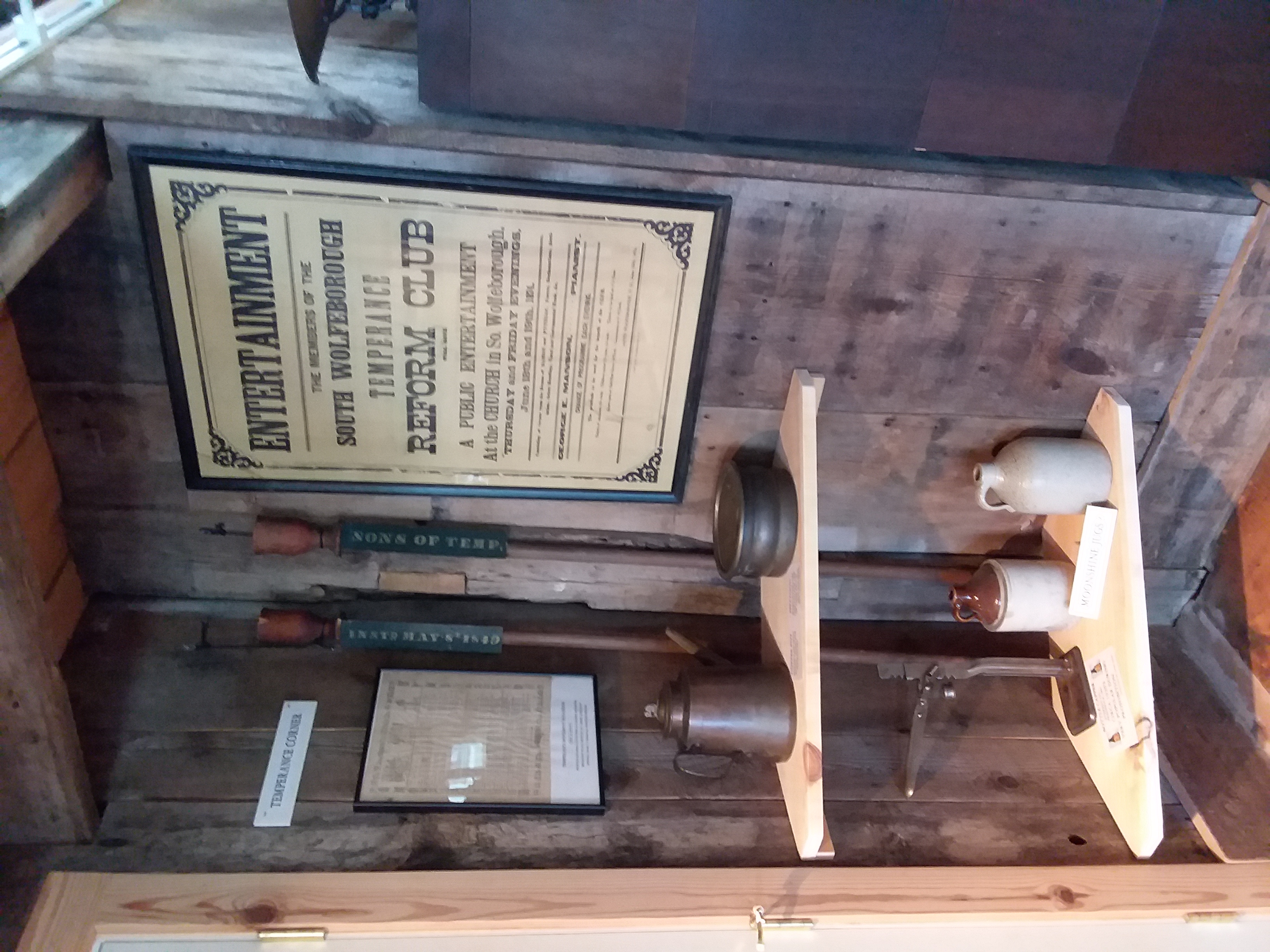 This corner has been dubbed "Temperance Corner". Alcohol abuse was considered a serious problem at several periods in U.S. history, even before the prohibition era. Depicted are related publications, temperance group standards (staffs carried in parades), and items that reflect the era. On the first shelf is a spitoon and a coffer pot (for the hangover). The bottom shelf has a bottle capper and two jugs, possibly used in brewing and holding moonshine.